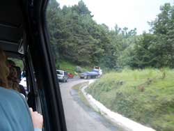 こうした山の登り道の途中で、スピードが出ないトラックの後になったから大変。1車線の細い道で、対向車もくるので、追い越すわけにもいかない。皆で数珠繋ぎになって走るしかなかった。山間を抜けてわずかに平地になったところで、順繰りにこのトラックを抜かしていったが、こうしたことが何回かあって、時間はどんどんと過ぎていった。
