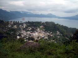 アンティグアを出て2時間半、ようやくアティトラン湖が見えてきた。曇り空の下の湖は、湖面が黒く、陰鬱な表情だったが、手前の可愛らしい家々と湖、その向こうに黒々と山が見え、晴れたらどんなにか美しい景色だろうかと想像するに難くなかった。