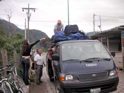 荷物にはホロがかぶせてあったので、濡れてはいなかった。窮屈だといっても、やはり安全が一番。グアテマラの長距離移動にシャトルバスはかかせない。 |