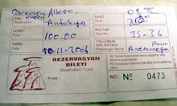 ギョレメからアレッポまで2回乗り換えがあるのだが、途中の地名が一言も書かれていなくて不安だというと、はいはいと、チケットに途中の地名をぐちゃぐちゃと書き足してくれた。