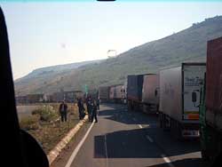 アンタクヤから貨物トラックが長い行列を作るトルコ国境までは1時間ほど。旅客のバスは行列を追い越してどんどん先に行けるので、特にここでロスタイムはない。運転助手の指示通りに建物に入って、トルコ出国のスタンプをもらう。バスに戻ると、確認のために役人がバスの中に入ってきて、一人ずつパスポートチェック。以上でトルコ側の手続きは終了だった。