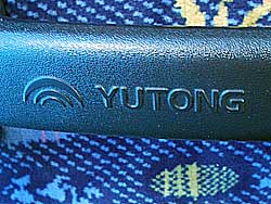 宇通客車YUTONGという会社のロゴが、座席の前の手すりや天井にペタペタ張られていた。