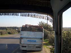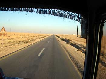 荷台に白人バックパッカーの姉ちゃんが2人乗っているピックアップトラックの後ろについて、なぜか持っているぬいぐるみを振って「ご挨拶ー!」みたいな遊びをした後、バスはダマスカスへの幹線道路をはずれて東に道を取った。いよいよシリアの砂漠に入っていくのだ。