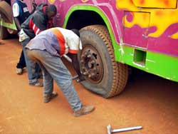 10時22分、第一回目のパンク。修理に15分くらいかかるので丁度いい休憩になる。みんなバスから降りて伸びをしたり、ブッシュトイレに行ったりして寛ぐ。誰も急げなんてことは言わないことになっている。