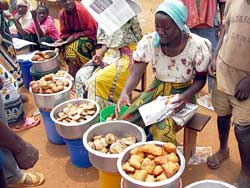 昼時に停車した村では、揚げパンやサモサなどを並べたに露天が出ておいしそうだった。私たちもお昼ご飯にしようと、バスを降りて揚げパンと揚げココナッツ餅のようなスナックを購入してバスに戻ろうとしたら、さぁ大変。