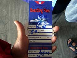 しばらくして、4つくらい隣のブースのGORKAH AIRLINESに呼び出されて荷物を預けて搭乗券をもらうことになった。何が書いてあるかよくわからない手書きのチケットでバスくらいに気軽なものだ。もちろん座席は全席自由席。