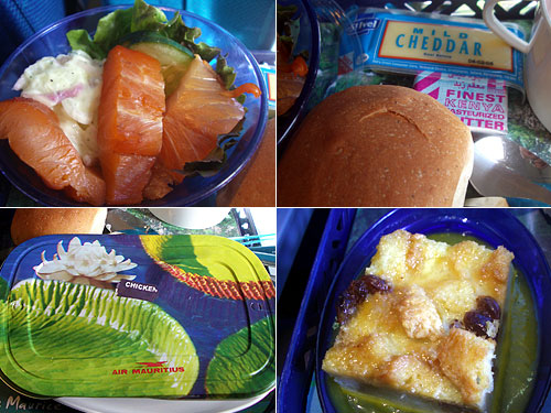 前菜はティラピア(いずみ鯛)のスモークとポテトサラダ。チェダーチーズとバターとパンにパン・プディングがデザート。スモーク・ティラピアはモーリシャス島内のスーパーでも見かけて、島の特産品のようだ。しっとりとした身は癖がなく、白ワインのいいおつまみになる。パン・プディングは下にオレンジのソースが引いてあり、プディングの甘みとソースの酸味、器の爽やかなブルーが夏のデザートを感じさせた。美しいパッケージはメインだ。