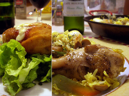 昨日のコロッケは上にモツァレラを乗せてオーブンで焼いた。レタスに乗せたらスターター。力足らずのサフランは黄色くならないので粉末のサフランを加えて色をつけた。色々な味がご飯にしみこんで、誰がやったって旨く出来るパエリア。特に今日のチキンの仕上げ方はモロッコ料理のタジンと原理は一緒なので、柔らかくジューシーに仕上がっている。そうか、スペインと近いもんね。