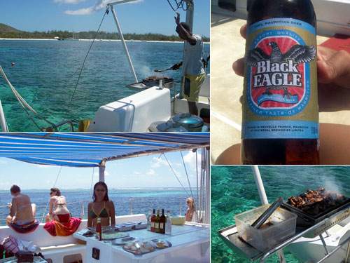 モーリシャスの海のツアーで食事付きとなると飲み放題(アルコールも)が定番なのかも?一昨日に引き続き今日のツアーも飲み放題。食事ができるまでまずビール。このビールはモーリシャスのビールだそうだ。旨い、旨い。カタマランの後部で炭焼きの煙があがる。ガブリエル島とフラット島の間は珊瑚礁。その上でのピクニックとはご機嫌だ。食事ができるまで、スタッフがスナックと飲み物をサーブして周る。こういうサービスも洒落ている。