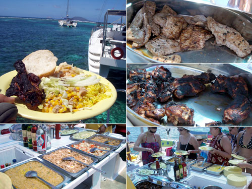 サフランライス、マカロニサラダ、ポテトサラダ、コーンとツナのサラダ、キュウリの薄切り、キャベツのサラダが並び、メインは白身魚とチキンの炭焼き。レディーファーストで女性から取る事になっていた。チキンは漬け焼きのようでほんのり甘い。にしても一昨日もそうだったがどうしてここまで黒焦げに。砂糖が入っているから焦げやすいのはわかるが。魚はジューシーでハーブの味がおいしかったなぁ。とにかく海の色、食事、もう最高の一日。