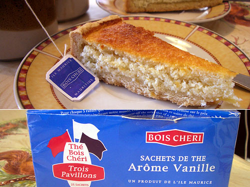 スーパーのケーキカウンターで売っているトルテはココナッツとチョコの2種類。前からちょっと興味があったのでココナッツを一つ買って二人でわけて食べてみた。シャキシャキとココナッツそのままが入っていて甘さ控えめのトルテはモーリシャスらしい素朴な味わい。これにモーリシャス特産のバニラティーを合わせる。この青いパッケージのバニラティーはティープランテーションが観光地にもなっているBOIS CHERIだが高くない。