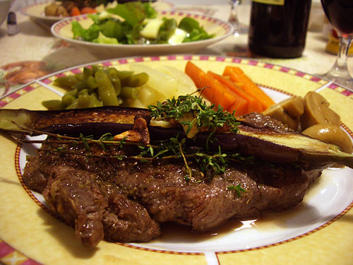 グランベのスーパーで細身のカッコいいなすがあった。これを半分に切ってステーキの上に置いたら素敵だろう。大根と人参と冷凍のインゲンは砂糖とバターと塩と水でグラッセ。マッシュルームは肉の焼き汁でソテー。ステーキにナスのソテーを載せて、カリカリのにんにくチップとタイムで飾り付けると、あーら素敵!うっふっふ。自分も満足のプレゼンが完成。