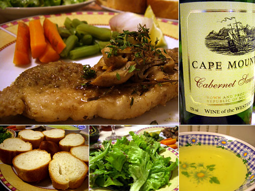 献立:ポークステーキ、バゲット、野菜の茹で汁スープ、サラダ、赤ワイン