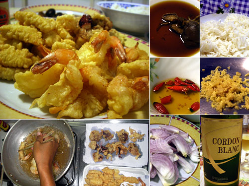 余った冷凍食品一掃でえび、たこ、イカのみの贅沢天婦羅ディナーだ。こんなにたくさんあったら余るだろうから、翌日の麺に入れたらいいと思っていたのにすっかり食べてしまった。天つゆは煮干と干し椎茸と醤油、砂糖、白ワインで。酢に赤唐辛子を入れたソース、しょうが、オニオンスライスも薬味としてはとても相性良し。開いたエビは30秒ほど高温で揚げたらプリップリ。開いてあるのがポイント?いや新鮮だから?とにかく秀逸だ。