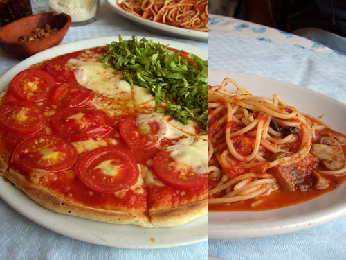 イタリアの国旗をイメージするピザイタリアはトマトがジューシー。モーリシャスのトマトは今一つだったが、ここのはトロッと甘くておいしい。生地は柔らかいパンみたいでもう一歩だが、トマトがおいしいのと、ボリュームが多いので許すとしよう。パスタはナスとマッシュルームとチーズのトマトソースで名前はロマーニャ。麺はゆで過ぎだったが、こちらもトマトソースがとてもいい味を出している。缶詰使っていないね、これ。