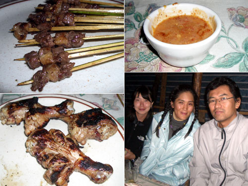 偶然に知り合った海外青年協力隊員の昭子さんとあおいさんと肩のこらない屋台で晩餐会。牛串は焼いたら一粒1cm角くらいになる肉が3つで一本。間の1つは脂身である。本来硬い腿肉あたりだろうが、ここまで小さくて脂身が間にあるのでジューシーでおいしく感じられる。チキンは胸肉も腿も新鮮そのものでジューシー。チキンは一人4回くらいお代わり。牛串は・・もう数え切れないほど食べた。旨い、旨い。