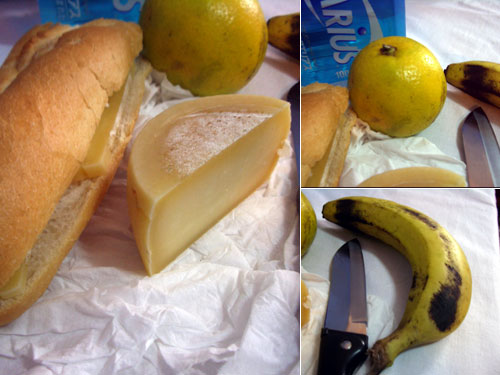 献立:ベネディクティーヌのチーズ、バゲット、みかん、バナナ