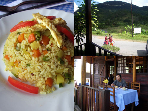 宿泊しているホテル・マンジャは川に沿った道路に面していて、レストランのテラス席からは川の向こうに森林が見えるという良い眺めだ。道路は村人が頻繁に通るので、村人の生活が見えるのも楽しい。眺めだけでなく、このレストランはなかなか味も良いせいか、昼も夜もそれなりに観光客が入ってくる。ここのメニューは野菜類がとても高い。炒飯に入っている野菜は冷凍品を思わせる角切りで、もしかしてこの村では野菜を作っていないのかと思わせた。
