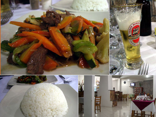 野菜がたくさん食べたくて2人とも同じメニューを選択。メインAr4000(約US$2)にご飯を1つ注文。Ar1000(約US$0.5)。さぁ、どんな料理なのかと楽しみにしていたら、しょうが、にんにく、醤油味のまさに中華料理が登場してきた。ウェイターはこのレストランのスペシャリテだと紹介したが、そうだろう。ここまで中華色が強いとマダガスカル料理でもフレンチでもない。思わぬ中華の出現に私たちは大喜び。大絶賛。