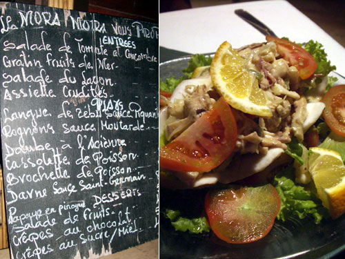 毎日黒板とにらめっこして解読していたので、フランス語のメニューもここのは大分わかるようになってきた。最後は贅沢にアントレを注文。大きな貝殻に山盛りのボイルしたイカのマヨネーズ和え。レモンを絞って食べるとおいしいこと。甲殻類はこうした冷製で前菜として少し食べるのがおいしいねぇ。とか言いながらあっという間に完食。実は大量だった。