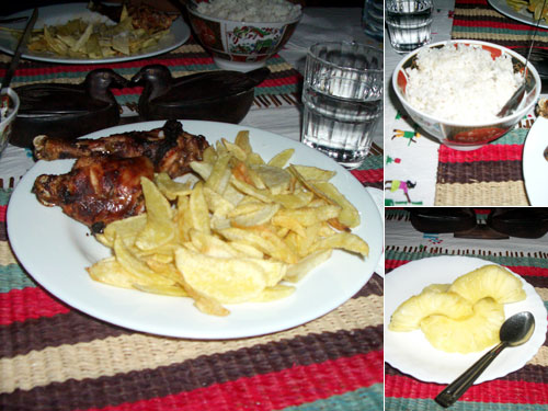 ホテルの食事は1時間半待ってやっと小さなパサパサの古いチキンのスモークが出てきた。付け合せにご飯を注文したのにフライドポテトも付いてきて、気が利くサービスだなぁと思っていたらご飯がやばい。殺虫剤の味。予約しないで宿泊した人にはこういう運命が待っているのだろうか。フライドポテトとパイナップルは非常においしい。翌日からご飯は全部他で調達することにした。