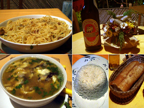 献立:スープ・シノワーズ、シーフードスパゲッティー、ご飯、ビール