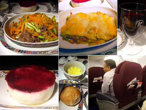 ヨハネスからナイロビ行きは夜中の0時20分発。午前1時に夜食が出た。もはや空腹ではないがケニア航空ビジネスクラスの夜食は試さなければと無理やり注文。牛肉とキュウリと人参の甘いソースの中華風炒めは薄甘いパンケーキの上に乗っていて、これはあまり受け付けられない。ラザニアは人参中心で普通。よかったのは陶器の器と質の高いパン、そしてチーズケーキがものすごくおいしかった。