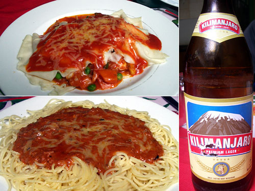 昼食難民になって、結局宿に戻ってきて朝と同じレストランで昼食。ここの値段が一番安いのだ。ラザニアは冷凍人参とグリーンピースを戻したもの、生のたまねぎとピーマンの刻んだの、茹でたラザニアパスタ、これらにトマトソースとチーズをかけてレンジで温めたもの。一つ一つの素材の味が・・・。っていうか何一つ溶け合っていない味だった。まだボロネーゼの方がましだったなぁ。ビールはキリマンジャロ。