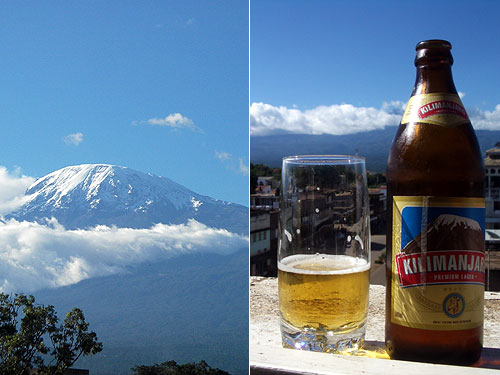モシをぶらついていたら、市場の向こうに巨大な山が見える。今まで曇って見えなかったキリマンジャロではないか。急げ!晴れたら行こうと思っていたホテル・キンドロコKindorokoの5階にある屋上バーへと走って行き、もっともっと晴れろーと祈りながらキリマンジャロビールを飲んで待つ。3時前から待って4時半過ぎに一番晴れた状態が写真のような感じ。んでもってまたすぐ雲に隠れてしまった。しかし十分。これでモシに来た目的達成だ。