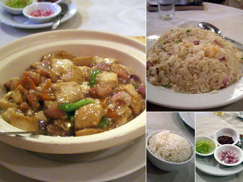 宴会が4つも入っているということで1時間半も待たされたが、待った甲斐ありの旨さ。豆腐は自家製で絹ごしくらいの柔らかさ。片面を油通ししてちょっとカリッとさせた豆腐と人参、アスパラ、たまねぎ、鶏肉が入りブイヨンと醤油でとろみをつけてまとめてある。生姜風味もきいていて久しぶりにうなる旨さだった。炒飯も、ああこれ本物。海老やイカもプリプリだ。卓上の酢唐辛子・玉葱・チリもアクセントには欠かせない。