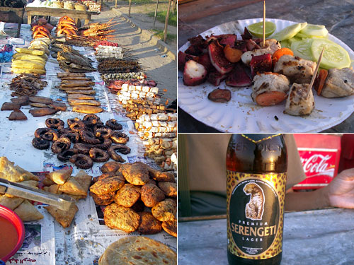 ガイドブックには「イスラム圏なのでビールは慎もう」と書かれたのだが、ある店に行くと「ビールもありまっせ」と言う。イスラムの人が言うならいいではないか。注文するといちいち外に買いに行ってくれる。並んでいる串焼きは油通ししてある。注文すると更に炭焼きして串をはずしてライムとチリをつけて紙皿に出してくれた。なかなかおいしい。値段はTs9000はいい加減なので要確認。