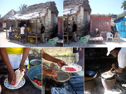 屋台の前を通ると、男たちが食べている物が旨そう。食べたいと言うとまかない飯だという。明日来るから作ってくれと頼んだが昨日。行ってみると何の準備をしていないのは予想通り。一人が野菜を買いに行き、一人はウガリ作り。沸騰した湯にとうもろこしの粉を入れて火を入れながらこねてできあがり。トマトと玉葱をおろし器で卸し、にんにく風味の油で青チリと炒め水を加えて塩で煮る。こちらがソースになるのだ。