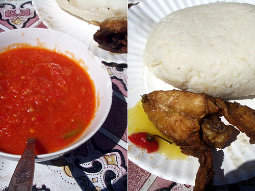 ウガリの出来立てを丼に入れて丸めて少し冷ましたものとキングフィッシュの切り身の素揚げが皿に。マンゴーチリソースも添えて。丼には2人分のトマトチリソースがやってきた。まずウガリを一口分右手で丸めて真ん中をくぼめてスプーンにしてソースをすくって食べる。予想外に旨い。マンゴーチリソースも甘辛くて揚げ物にぴったり。ええ?この店ではポンフリと牛串焼きしか出していない。これを定番にして売り出すべきなのに。なぜだ。