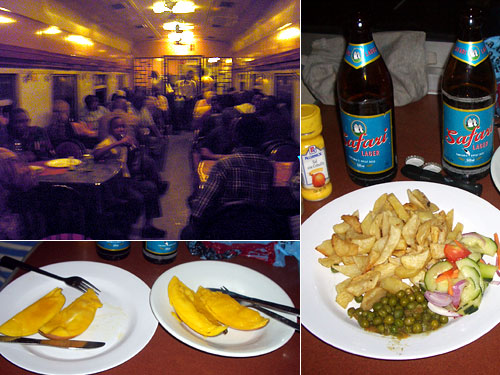 タザラ鉄道には食堂車もあるがファーストクラスではルームサービスもしてくれる。魚、鶏のいずれかとご飯、ウガリ、ポテトのいずれか、あるいはポテトだけ、全てTs2500均一。我々はポテト1つだけ注文。ウガリとご飯チームはすぐに出たが私たちは1時間半も待たされた。しかし揚げ油も新しくおいしい。サラダと豆があるのも気が利いていた。ビールはあまり冷えていないが安くていい。持ち込みマンゴーでしめ。