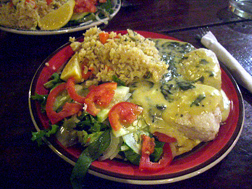 この宿では日替わりで2種のメニューが出されるようだ。1種はベジタリアン。今日は魚のメニューとベジタリアンはチリビーンズだった。大きな魚の大きな切り身2つにはたっぷりとガーリックの聞いたほうれん草入りのホワイトソース。淡白な魚に良く合う。リゾットは野菜のだしがよく利いているアルデンテ。とても多いボリュームで男性でも食べきれないくらいだった。清潔で家庭的な料理。外で食べるよりもずっといい。