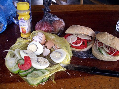 ヴィランクーロには焼きたてのパンを出す店が数軒ある。宿の近くにもあるのだが、昼用にはマーケットの近くのパン屋で買った。一種類のパンしか売っていなくて、木の戸棚を開けて出してくれたパンはまだほのかに温かかった。これにマーケットで売り歩いている少年からほのかに温かいゆで卵、トマトやきゅうりを購入して、宿でサンドイッチを作って食べた。パンがおいしいから満足度が高い。