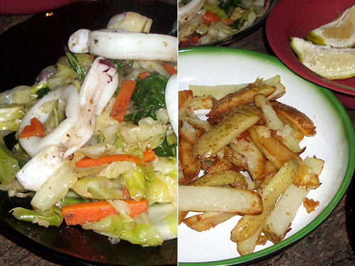献立:イカと野菜の炒め、フライドポテト、白ワイン