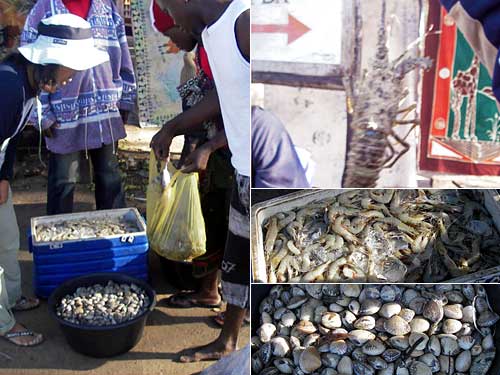トーフは小さな村だが野菜や魚介類や食材を売る小さな店というか屋台が全部で10軒ほどある。皆1m幅くらいのテーブルで商売している。魚介類に至っては、はまぐりのような貝と海老は冷蔵庫で常備されていてクーラーで持ち込まれているが、あとは漁師さんが海から直送してくるらしい。この日の朝8時半は新鮮なイカ、大きな魚、ロブスターまで出ていた。この時を逃した私たちはロブスターを食べ損ねた。