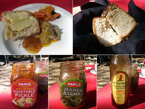 最初に出てきたのは、ケーキとパンの中間のように柔らかいパン。これと共に南ア産のピクルスが2種出てきた。一つはチリで辛く漬け込んだ野菜のピクルスと、もう一つはマンゴーのピクルス。既製品をそのまま出すなんて手抜きだなぁと思っていたが、このマンゴーピクルスが侮れないおいしさ。南アの都市に行ったら探してみよう。