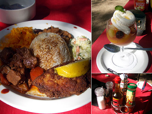 メインはビーフか魚のどちらがいいかと聞かれて、長く悩んでいたら両方持ってきましょうということになった。ビーフはカレーのような味でテーブルのチャツネとマッチ。白身の魚のフライも大きくてご飯や豆、コールスロー、人参サラダと、とても食べきれない程の量だった。デザートは冷たいフルーツポンチに甘くない生クリーム添え。これでさっぱりとしめくくり。