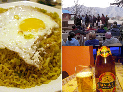 とっても素敵な場所だが食糧調達が困難なため仕方なく明日は出ることにした。レソトたった2泊。最後の夕食は余った野菜、玉葱とキャベツと卵の入ったチャーハンにカレー粉を振ってカレーチャーハンに。レソトではビールも作っている。日本の大瓶くらいの大きさで、味はサッパリして飲みやすい。宿で購入なので高い。毎夕5時になると地元のコーラスが発表会。夕焼けに染まる山を背景に輪唱が美しい。