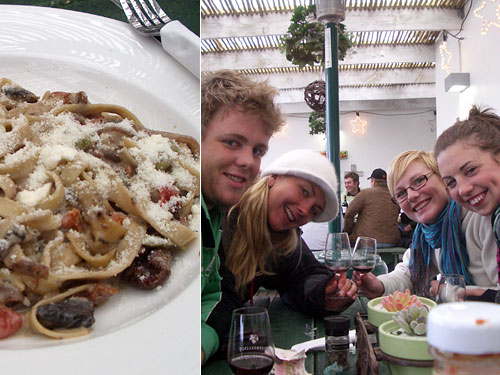 夫はマッシュルームのパスタ。マッシュルームがたっぷり入ったクリームパスタにパルメザンチーズ。大きく切ったドライトマトの塊は、噛締めると甘酸っぱくて太陽の味がする。ドライトマトってクリームパスタに入れてもいいのか、と新たなる組み合わせが面白かった。しかし、屋外の席はビニールの屋根と壁があるもののパスタには不向きな場所だ。参加者は全員赤い顔でご陽気な笑い声が絶えない。