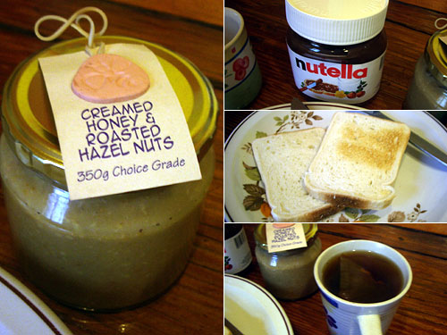 昨日のワイナリーツアーの途中で訪れたチョコレートショップで見つけたヘーゼルナッツハニー。本当にヘーゼルナッツと蜂蜜を混ぜたただけの素朴なペーストらしく、パンに塗ろうとしても固まってなかなか塗れない。しかし、それだけに味はいい。香ばしいナッツの味とはちみつの組み合わせはヌテラを超えないまでも同等においしいのではないだろうか。朝食がまた楽しくなった。