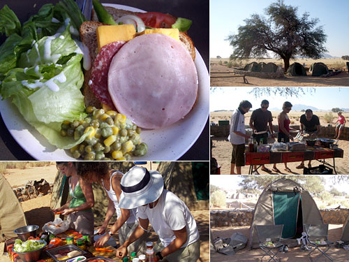 最初から薄々気づいてきたのだが、男二人スタッフの食事は準備に時間がかかる。30代以上のおばさん参加者(失礼!)は見るにみかねて、最初は遠慮がちに、しかし回を重ねるごとに大胆に食事の準備に参加するようになっていった。キャンプ地は木陰に覆われて昼間も快適。準備ができると好きなだけ取って自分のテントの前のチェアで食べるのだ。