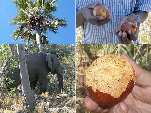 午後の散策で、象が椰子の木に体当たりして幹を揺らし、落とした実を旨そうに食べているのを観察。で、何かというと茶色の硬い椰子の実。これを2つカンカンと打ち合わせると硬い外皮がとれて中から乾いたスポンジ状の実が現れる。種との間の5mm程の実を歯で擦り取って食べてみると、パサパサとして甘い。クッキーのようなフルーツなのだった。おいしい木とそうでない木があるらしく、何個も味見してお腹いっぱいになってしまった。