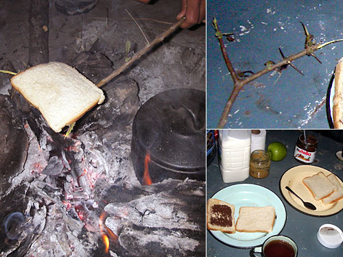 朝から焚き火は望めないだろうと思っていたら、ガイドさんが一晩中火を絶やさないでいてくれたお陰でお茶を飲むことができた。火にかざしてトーストを作ろうとしていたら、どこからか2股になった枝を持ってきてくれて、これでトーストも焼ける。自然は様々な道具に満ち溢れているのねぇ。そしてガイドさんは即座にこうした道具を使ってたちまち生活を豊かにしてくれるのだった。先立ちあってこそのワイルドライフ。