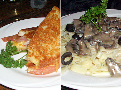 昨日「マッシュルームがない」と言われているのに「きのこソースはないのか」と聞いた夫に、ウェイトレスが今日はリベンジとばかりに「きのこが入った」と言ってくる。「今日はきのこの気分じゃないんだよなぁ」という夫だが、まぁまぁ食べてあげなさいよときのこスパゲッティーを勧めた。生のマッシュルームなどが使われていておいしい。ホットサンドは食パン2枚分なのでボリューム少ない。もっと食べたかった。