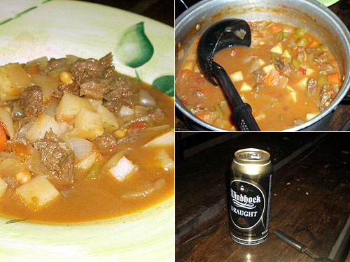 久しぶりにグラシュを作る。玉葱とにんにくのみじん切りをトロトロになるまで炒め、2cm各に切った赤みの牛肉に塩・コショウ・パプリカをまぶしたものを加えて、更に10分くらい炒める。水、人参、ジャガイモ、ピーマン、トマト、豆を加えて煮込む。アクが出たらすくって、出なくなったころにブイヨンと更にパプリカを加えて煮込む。火を止めて2時間も置くと煮込まれてくるので、食べる間際に再度温めて食べる。豆はインド人からもらったもの。