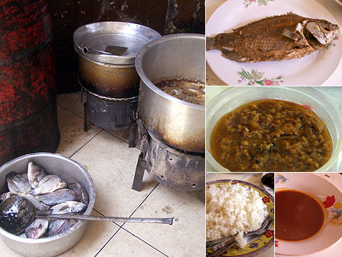 吹き抜けになった廊下の奥に炭火のコンロを据えてキッチンとして営業している宿の食堂。こんな設備だけれどちゃんとおいしい食事を作ってくれる。魚を揚げる香りが漂い始めたので、食堂に行くと揚げたてのサマキ(魚)のフライ定食にありつけた。魚はヴィクトリア湖のティラピアで骨が固くて多いのだが身がおいしい。デミグラス味のトマトソースも美味。ショップライトでキーマカレーの副菜も買って持ち込んだ。ショップライトの惣菜は割高。