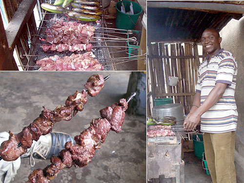このバーの左側の軒下に店を出させてもらっている串焼き屋がある。値段は向かいの食堂の半分。今日はこっち。昨日の焼きすぎにこりたので、兄さんにつきっきりで見て9分経過した段階で引き上げてもらった。兄さんは「こんな少ない時間でいいの?」というが、これでミディアムレア。肉汁が滴り落ちるおいしい焼き具合だ。ここではレバー串焼きとバナナ焼きもやっていた。向かいの店よりもかなり売れている。腰の低さと値段の安さか。